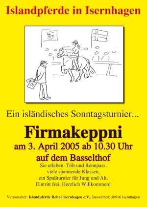 Internationale Norddeutsche Islandpferde- Meisterschaften 2005... ...zum ersten Mal in unserem Landesverband Der sperrige Name hat offenbar die treuen Teinehmer unseres guten alten OSI Basselthof nicht verschreckt. Weit über 300 Nennungen liegen bereits vor. National und international hochplazierte Reiter und Pferde, darunter auch viele WM-Finalisten, haben genannt. Es wird bestimmt ein richtige Meisterschaft! |