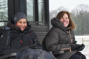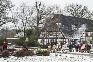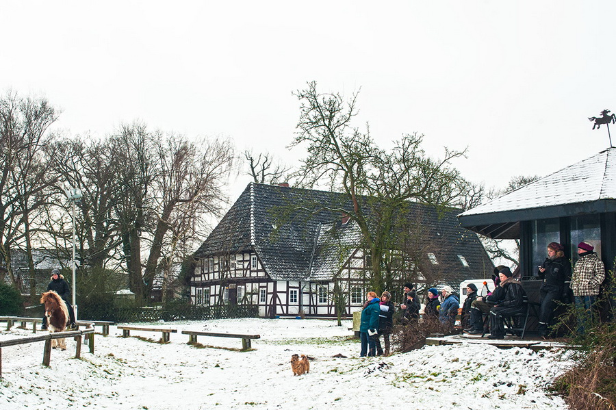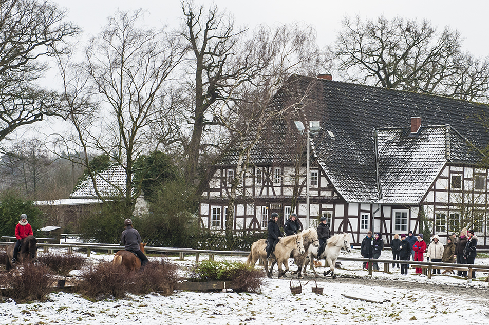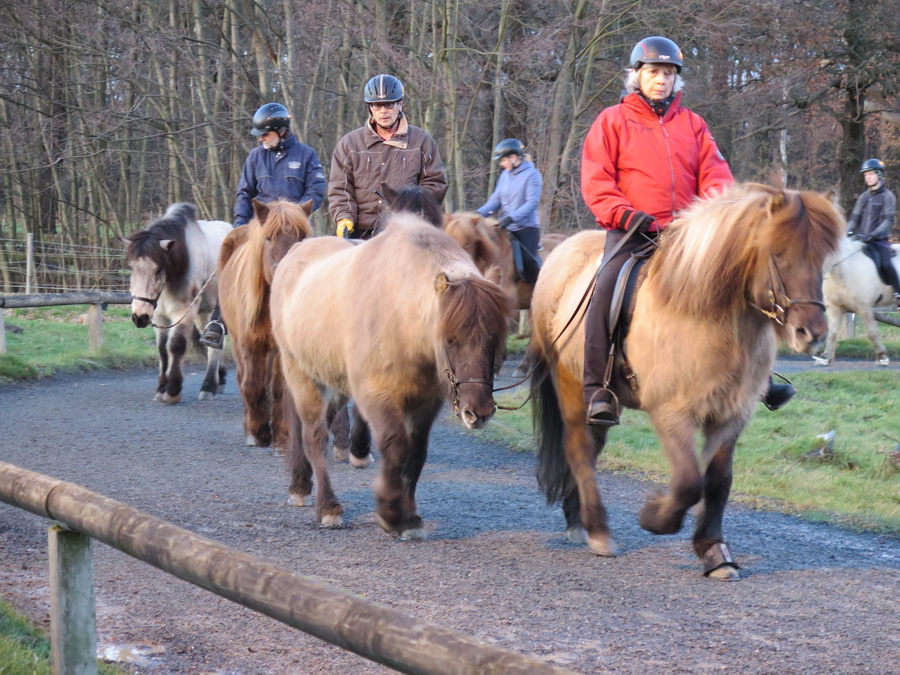 Genau am ersten Tag des Lehrgangs „Tölt und Pass im Schnee“ war unser Hof - wie bestellt - mit Schnee gepudert. Die 18 Teilnehmer/-innen und die beiden Reitlehrerinnen Suzan Beuk und Marlise Grimm hatten, nicht nur deswegen, erkennbar viel Spaß und jede Menge gute Laune bei diesem Wochenendkurs. Es gab etwas Theorie und viel Praxis. Auf unserer „Großleinwand“ waren die Videoaufzeichnungen der Übungen zu sehen und konnten kompetent besprochen werden. Und noch ein Hinweis: Der Wochenendlehrgang unter Leitung von Charlotte Cramer am 14./15. Februar mit dem Thema „Dressurmäßiges Arbeiten und Sitzschulung“ ist geeignet für alle Reiter und Pferde zur Verbesserung eines harmonischen Miteinanders von Pferd und Reiter. |