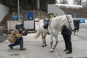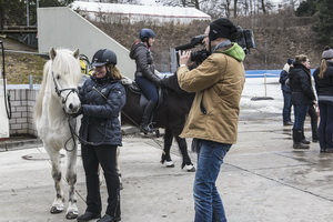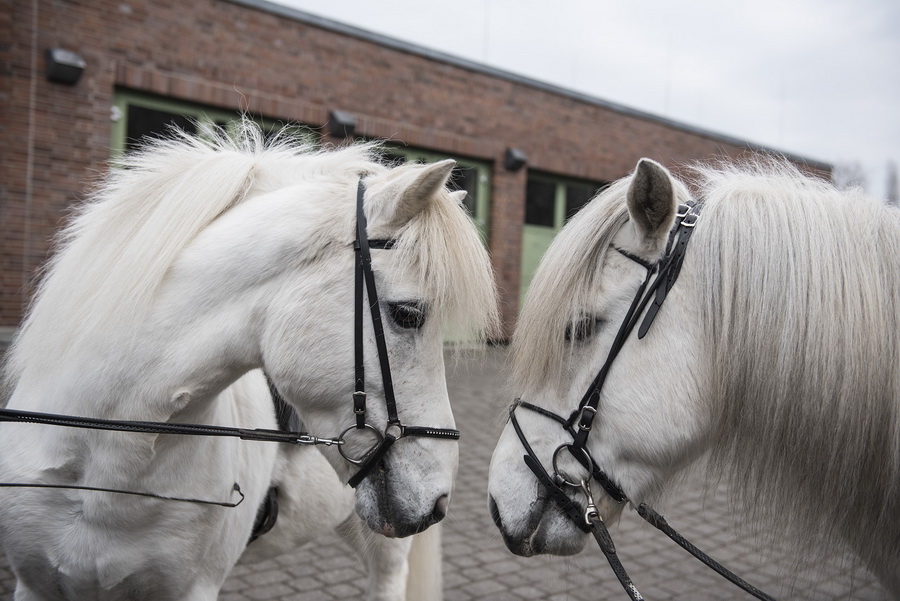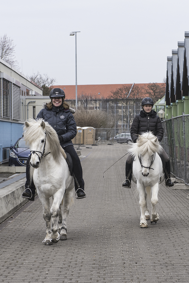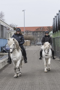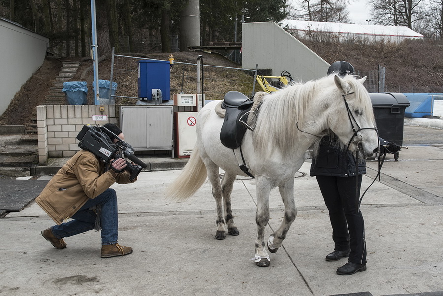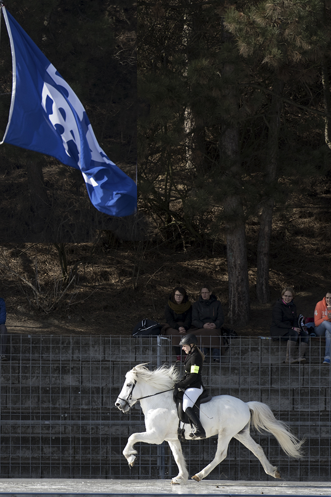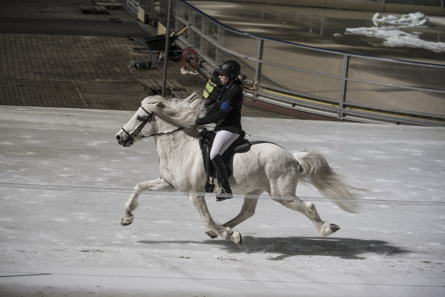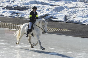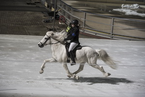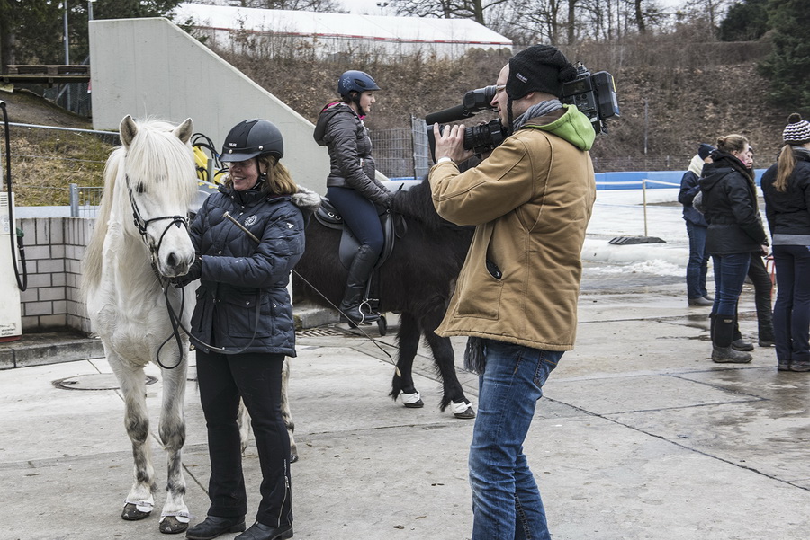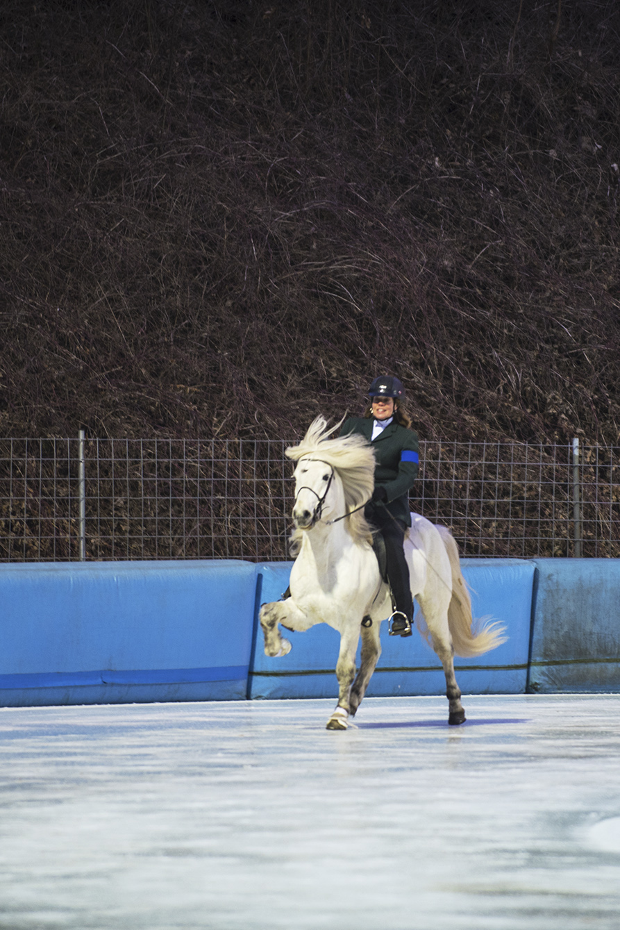 ...Marlise und Charlotte waren mit Magni und Gáski dabei. Es war ein wirklich cooles Erlebnis, in dem riesigen Eisstadion vor großem Publikum und in eindruchsvoller Konkurrenz anzutreten. Unsere beiden schneeweißen Hengste machten ihre Sache super. Zunächst zogen sie mit ihrem äußerst gepflegten Erscheinungsbild das Interesse des Fersehteams an, (O-Ton Aufnahmeleiter: "Na der sieht ja wunderschön aus, und Weiß ist auch wegen der Kontraste die beste Farbe." :-). |